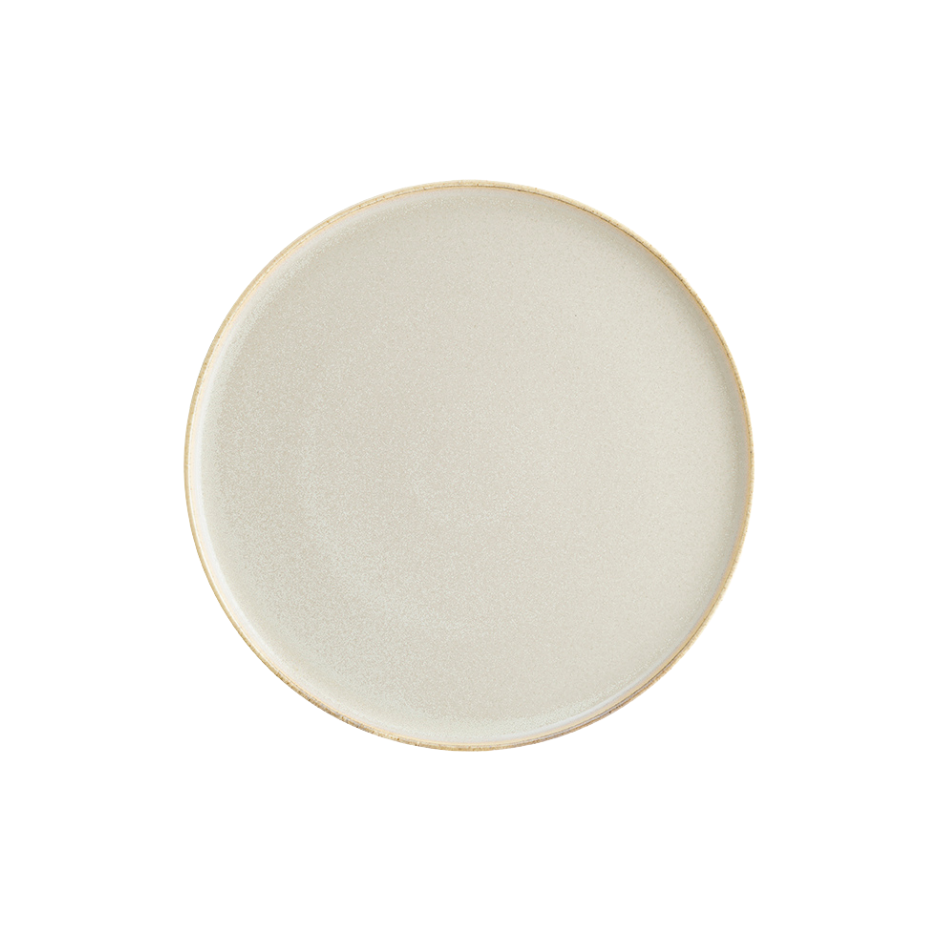 Flat tallrik i sandfärg. Används som dessert eller förrättstallrik.