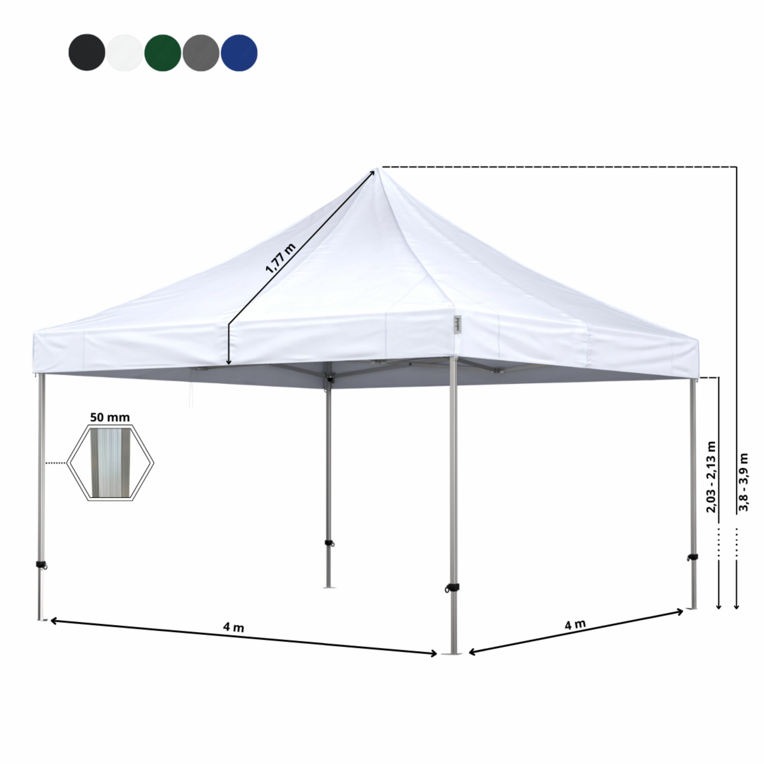 Pop up tält med tak och väska med hjul Tälten har ett stadigt stativ av 50mm sexkantig aluminiumprofil. Tak och väggar är tillverkade av kraftig vattentät polyesterväv (320g/m2). Allt monteras med enkelhet på bara ett par minuter. Tältet levereras i bag med hjul som skyddar tältet under transport.